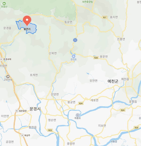 용연리의 위치는 지도상으로 볼 때 문경시와 예천군과 근접해 있습니다.