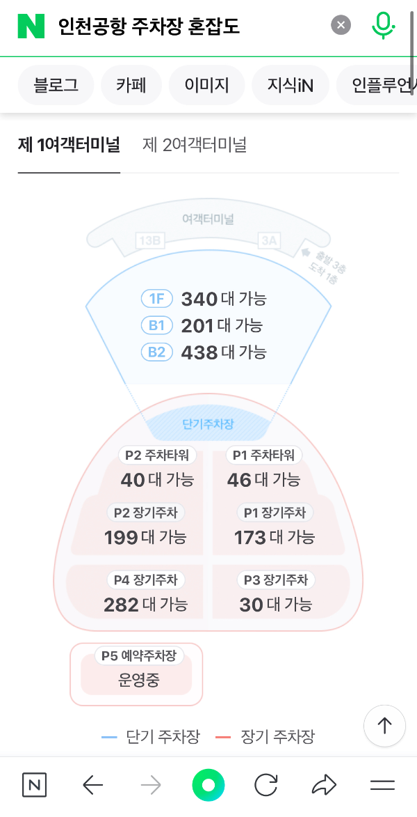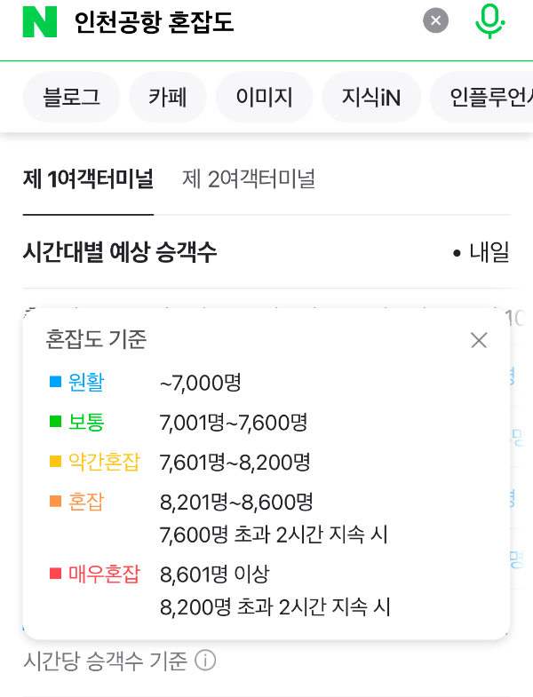 •네이버 검색 페이지에서 ‘인천공항 혼잡도’ 검색결과 상단 제1/제2 여객터미널 선택